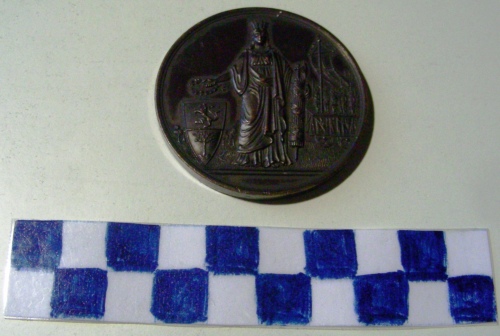 Di forma circolare. Sul recto, in rilievo, figura in piedi dell' Italia turrita che stringe nella destra un serto d'alloro con sottostante scudo bipartito con leone rampante sovrastante albero senza foglie, con la sinistra regge un fascio littorio stretto da nastro con iscrizione. A destra, stilizzata la compagnia della morte sul carroccio e sovratante stendardo. Sul verso, iscrizione sotto stella a cinque punte.