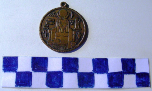 Di forma circolare. Sul recto, al centro, in rilievo una sfinge con in secondo piano quattro piramidi e sole nascente raggiante. In esergo geroglifici. Sul verso, al centro in rilievo una figura simbolica rappresentante una divinità egizia circondata da geroglifici.