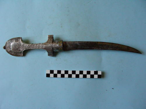 Lama ricurva con filo al tallone nella parte concava ed a ¾ nella parte convessa. Impugnatura rastremata al centro e di sezione quadrangolare con tipica cappetta a mezzaluna, al cui centro si evidenzia il bottone di fissaggio del codolo. È completamente rivestita di lamina metallica che nella parte esposta è in argento finemente inciso a bulino; nel lato nascosto e nelle pareti laterali è dottone e priva di decorazioni. Sono presenti nella parte centrale due fascette di rinforzo, saldate a stagno sulla sottostante lamina. La guardia è un semplice allargamento dellimpugnatura e termina con un anello dargento inciso che, nel tratto adiacente alla lama è decorato con smalti di colore verde e giallo.