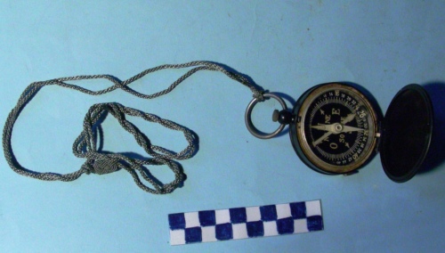 Corpo di forma circolare, di colore grigio scuro, con coperchio apribile tramite pulsante posto alla sommità entro un anello. Cordoncino di colore grigio, fissato all'anello e terminante con un cappio fermato da un nodo scorrevole formato da tre fili intrecciati. All'interno, sopra una base di colore nero con l'indicazione dei punti cardinali e dei gradi di colore bianco, sono posate due frecce bianche. La prima più bassa ruota seguendo lo spostamento del coperchio di vetro dotato di una piccola lente d'ingrandimento; la seconda è costituita dall'ago calamitato che segnala il Nord magnetico. Sulla faccia laterale è posto un piccolo bottone rettangolare zigrinato per il bloccaggio dell'ago magnetico.