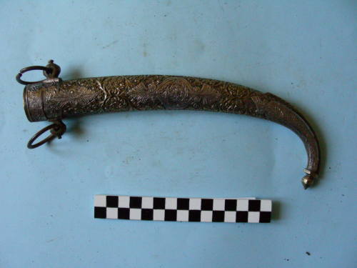 in legno rivestito da due lamine dottone a conchiglia, unite per la generatrice. La lamina esterna è decorata a sbalzo con motivi floreali e placcature di lamina dargento finemente incisa. La lamina interna presenta leggere incisioni geometriche. Sotto la cappa, in posizione simmetrica, sporgono due elementi forati che portano due campanelle di ferro. Il puntale, molto ricurvo, ha una cresta di rinforzo nella parte convessa e termina con un bottone sferico.