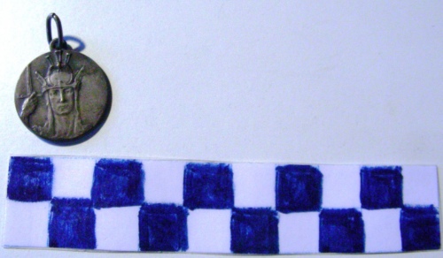 Di forma circolare. Sul recto, al centro, in rilievo busto accollato di fronte di una figura allegorica femminile, con elmo e spada alzata nella mano destra. Sul verso, in rilievo al centro, fascio littorio a destra che divide un iscrizione. Ulteriore iscrizione lungo la corona. Anello all'appiccagnolo.