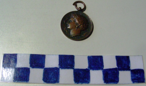 Di forma circolare. Sul recto, al centro in rilievo, entro giro perlinato, busto accollato di donna allegorica a sinistra, contornata da quattro delfini. Iscrizione sotto la figura. Sul verso, iscrizione entro giro perlinato. Annello all'appiccagnolo.