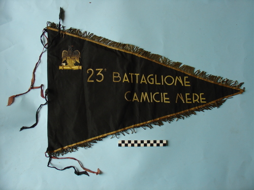 a forma triangolare. Al dritto, tela nera con scritte ricamate a filo dorato, decorata nell'angolo in alto vicino all'attaccatura con un'aquila dorata ad ali spiegate che poggia su un fascio littorio con scure a destra. Al rovescio, tela rossa con stemma ricamato al centro. Frangia dorata al bordo dei due lati maggiori. Tre nastri di fissaggio allasta sul lato minore.