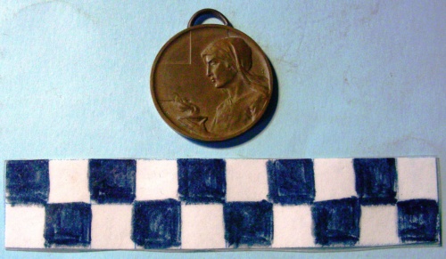 Di forma circolare. Sul recto, al centro, in rilievo, una crocerossina velata, munita di una croce sul petto, nell'atto di porgere una tazza dal contenuto fumante. Sullo sfondo, croce greca di grandi dimensioni parzialmente coperta dalla figura. Iscrizione lungo la corona in basso a sinistra. Verso bipartito orizzontalmente. Nella parte superiore croce greca su decorazioni a motivi floreali. Nella parte inferiore iscrizioni