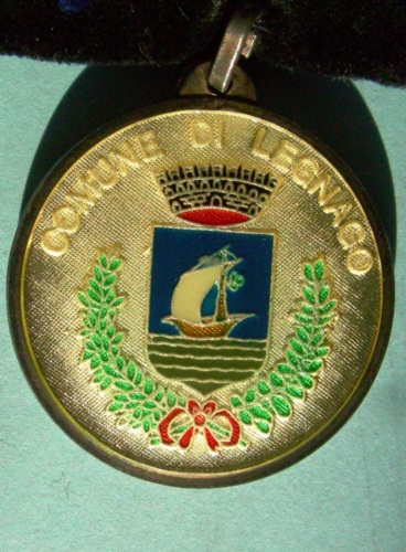 Disco di metallo zigrinato color oro con superfice platificata. Sul dritto, al centro uno scudo d'azzurro alla barca al naturale su acque di verde ondate d'argento ad un tronco d'albero radicato, nascente dalla barca, nodoso di tre pezzi, il superiore a a destra fogliato di tre, il tutto al naturale, alla vela bianca, gonfia verso sinistra, appoggiante al tronco. Lo scudo sarà sormontato dalla speciale corona del comune. lo scudo è circondato da un ramo d'alloro ed uno di quercia legati alla base da fiocco rosso. Iscrizione sulla parte superiore della corona. Sul verso iscrizione incisa.. Anello alla maglietta.