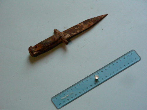 Lama dritta a un filo, punta triangolare al centro e controfilo; sguscio su entrambi i lati fino quasi alla punta. Guardia a croce. Impugnatura accorciata eliminando la parte di baionetta comprendente il fermo a bottone; a due guancette fissate da due spinotti.