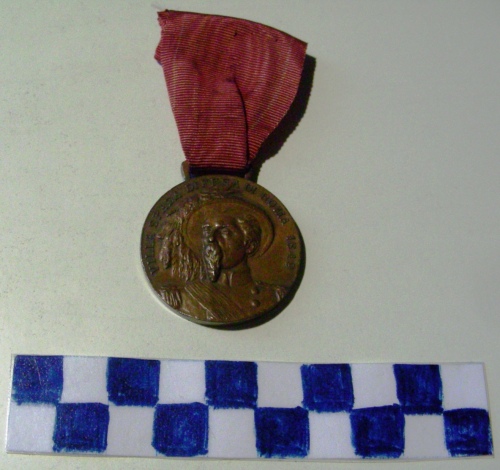 Di forma circolare. Sul recto, al centro, in rilievo, busto di tre quarti in grande uniforme e varia del generale Manara. Iscrizione lungo la corona. Sul verso, iscrizione entro corona d'alloro. Nastrino cremisi con inserti bianchi