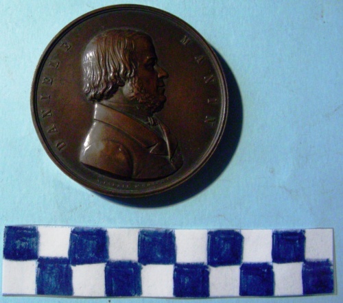 Di forma circolare. Sul recto, in rilievo, busto accollato a destra di Daniele Manin. Iscrizioni lungo la corona e sotto la figura. Sul verso, in rilievo, Manin portato a spalla dalla folla festante con sullo sfondo il Ponte dei Sospiri. Iscrizione lungo la corona.