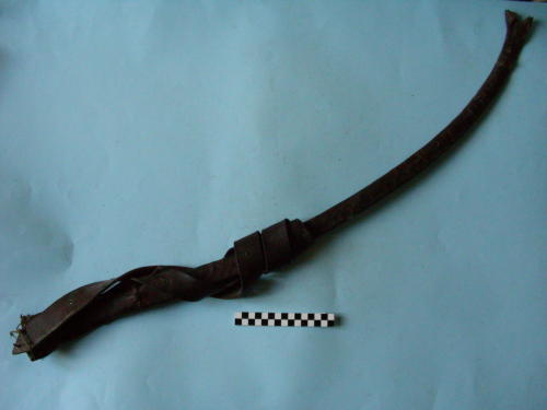 in cuoio rosso, rivestito in pelle rossa; decorato da motivi impressi geometrici e a forma di foglia, doppio cerchio e "X". E' presente la cinghia di sospensione. Il puntale si allarga rispetto al fodero stesso e si biforca; è rinforzato internamente da una lamina.