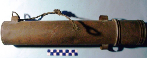 Di forma cilindrica. In lamiera con tappo ad incastro con chiusura tramite gancio che scorre lungo il diametro. Sul tappo, ulteriore coperchio di chiusura. Sono presenti tre magliette saldate a stagno per il trasporto. Resti di filo animato legati alla maglietta inferiore.