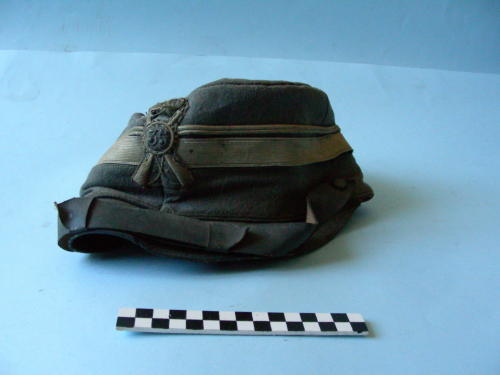 Di forma circolare con visiera prominente e sottogola a cinturino regolabile fissato alle tempie con due bottoni e posizionato sopra la visiera; fregio con stemma della fanteria in posizione frontale sovrapposto a doppia banda color argento. Interno foderato di colore marrone.