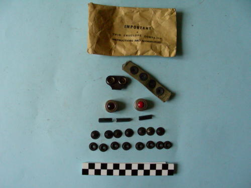 Busta rettangolare con chiusura a graffetta ripiegabile contenente 1 striscia di tessuto con 4 bottoni automatici completi, 1 gancio di metallo con 2 alloggiamenti per bottone automatico, 2 manopole-spia di forma cilindrica con disco centrale rosso, 3 graffe dentate, 8 femmine di bottone automatico e 7 maschi di bottone automatico.