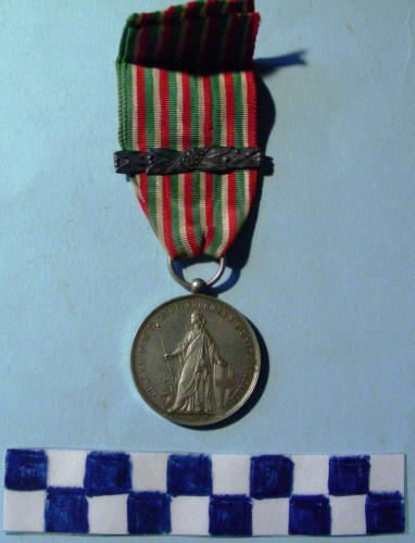 Di forma circolare. Sul recto, al centro, in rilievo, busto accollato a sinistra di Vittorio Emanuele II. Iscrizioni lungo la corona. Sul verso, al centro, in rilievo, figura allegorica femminile dell'Italia in piedi a sinistra con lancia e scudo sabaudo. Iscrizioni lungo la corona. Anello all'appiccagnolo e nastro con tricolore italiano ripetuto sei volte. Sul nastrino è applicata una barretta decorata a motivi floreali con al centro iscrizione.