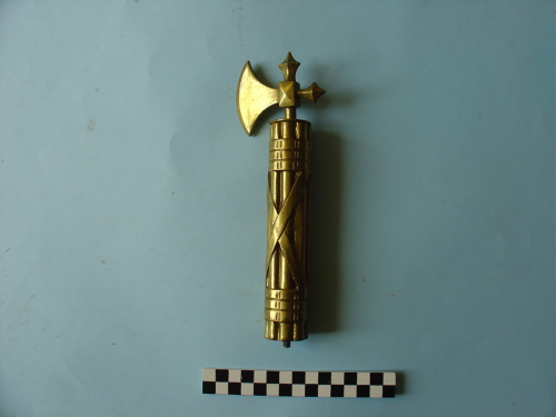 fascio littorio di primo tipo, con scure nella parte superiore, in fusione a tutto tondo. Conserva nella parte inferiore una vite in ferro. Il nastro che forma l'incrocio sul fascio è liscio.