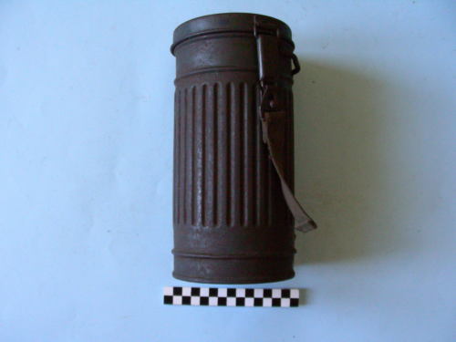 Di forma cilindrica, con scanalature verticali; coperchio con chiusura a gancio a molla azionabile tramite fettuccia. Tre magliette di fissaggio della tracolla; le due magliette superiori sono in posizione diagonale. Verniciatura color verde scuro. All'interno del coperchio è presente un contenitore quadrato, con angoli arrotondati, sportellino a pressione e molla all'interno.