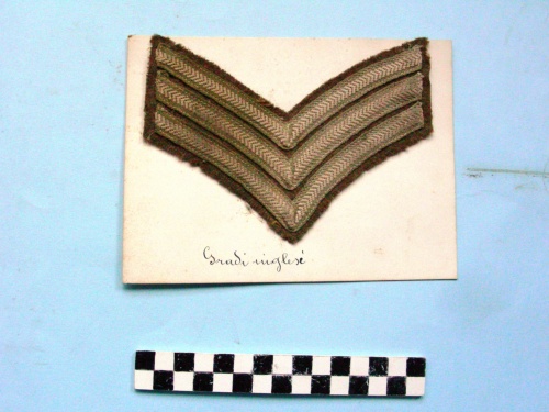 Panno ritagliato a forma di "V" con cuciti tre galloni ricamati di colore più chiaro.
