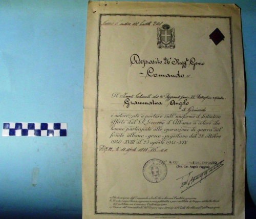 Di forma rettangolare con decorazione lungo il perimetro con stemma reale nella parte superiore al centro, distintivo fissato tramite spilla in alto a destra, timbro del Comando emittente in calce e bustina contenitore per il distintivo fissata con spillo alla parte posteriore. Il distintivo è forma romboidale con il perimetro azzurro e parte centrale rossa. Dall'alto al basso in oro, la corona di Skanderberg, il nodo Savoia, una scimitarra con impugnatura a sinistra ed infine un fascio littorio al vertice inferiore. Iscrizione dorata sul perimetro. Sul verso, spilla di fissaggio.