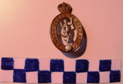 Spilla di forma ovale, dorata con iscrizione e corona regia sovrastante.Al centro, stilizzata, la figura mitologica del dio Mercurio di colore argento, volto a destra. Sul verso, due magliette di fissaggio.