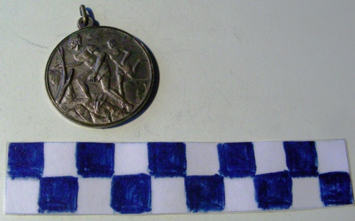 Di forma circolare. Sul recto, al centro, in rilievo, le figure di due atleti in maglietta e calzoncini che corrono a sinistra su di un terreno scosceso. Sul verso, al centro iscrizione. Anello all'appiccagnolo.