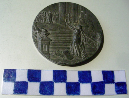 Di forma circolare. Sul recto, sulla parte superiore, libro con iscrizione. Sullo sfondo, un ramo di alloro. Iscrizione al centro entro cornice. In esergo, ramo di alloro. Sul verso, figura allegorica femminile con le braccia protese ed ai piedi lo scudo della città di Trieste con sottostante palma, nell'atto di salire una scalinata tra due braceri ad incontrare un gruppo di figure tra colonne con al centro l'Italia con sovrastante stella a cinque punte raggiante. Iscrizione in esergo.