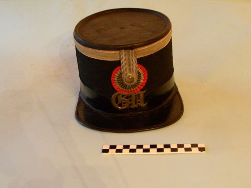 Corpo di foggia alta, circolare, rivestito di panno nero, fascia dorata all'imperiale, fascia alta sul bordo inferiore, visiera, fregio frontale della Guardia Nazionale, cappietto poggiante su coccarda tricolore, profili dorati verticali. Interno foderato di raso rosso con due magliette laterali ai lati dell'imperiale e con passante centrale, fascia interna decorata al bordo superiore con motivi floreali.