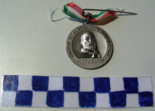Di forma circolare. Sul recto, in tondo, busto accollato di tre quarti di Garibaldi con fazzoletto al collo. Iscrizione lungo la corona e nell'esergo. Sul verso iscrizione con ramo d'alloro a destra. Anello all'appiccagnolo con spilla di fissaggio e nastrino tricolore.