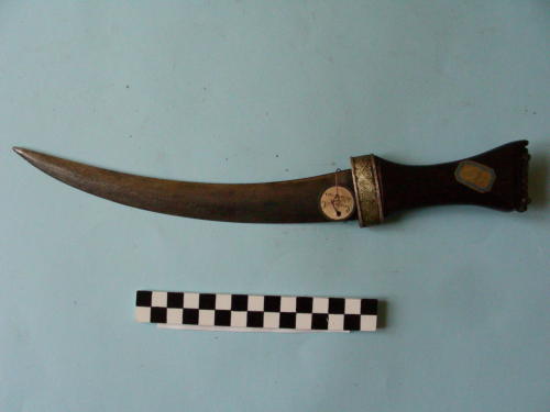 lama fucinata curva, a doppio filo, piuttosto spessa e robusta; impugnatura con inserto lavorato alla coccia. La guardia è un'ingrossamento dell’impugnatura ed è decorata con una fascia incisa a volute.