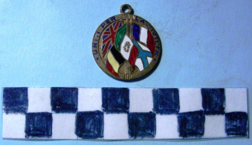 Di forma circolare. Sul recto, bandiere del Regno d'Italia, Regno Unito, Belgio, Francia e Finlandia. Iscrizione di colore blu lungo la corona.