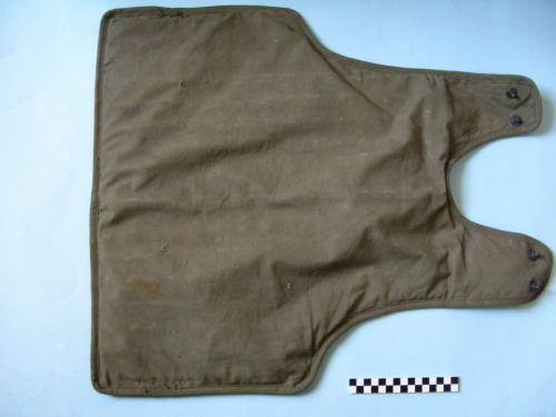 A forma anatomica, per la protezione della schiena; due coppie di maschi di bottoni automatici sulle spalle. Contiene placche metalliche rivestite da tessuto, probabilmente rayon.