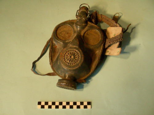 Facciale con due lenti circolari, protuberanza anteriore per accogliere il naso ed una valvola di scarico all'altezza della bocca, ulteriore valvola sotto la mentoniera. Protezione laterale su cui sono fissate le cinghie di fissaggio cucite sul bordo e raccordate alla nuca su una lamina che accoglie un fermo a "V" per l'inserimento del filtro. Sul frontale raccorso per l'inserimento del tubo del filtro fermato da una clip.