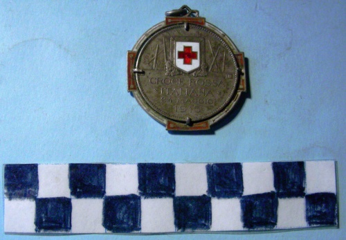 Di forma circolare inserita in una montatura circolare di smalto bianco decorata in oro con quattro rettangoli smaltati in rosso e decorazioni geometriche in oro. Sul recto, al centro, in rilievo, entro cerchio perlinato, figura allegorica femminile, velata, nell'atto di soccorrere un ferito. Sullo sfondo, un gruppo di soldati in azione a sinistra e cannone sulla destra. Iscrizione lungo la corona e nella parte inferiore. Sul verso, in perlinato, croce smaltata in rosso in campo bianco entro scudo decorato a motivi floreali. Ai lati, baionette incrociate. Iscrizione nella parte inferiore. Anello all'appiccagnolo