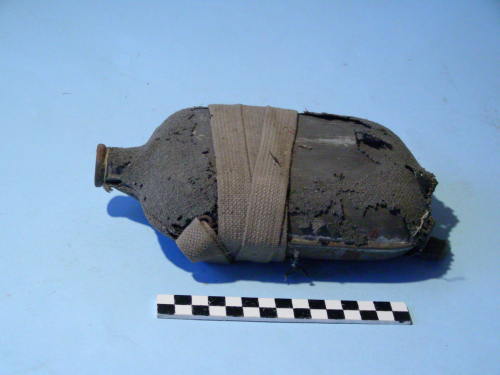 Corpo piatto. Rivestito di panno grigio-verde cucito; due magliette laterali di fissaggio per la tracolla chiusa con una fibbia.