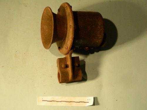 Corpo cilindrico sormontato da piatto con flangia fissata da sei viti e tromba; nella parte inferiore morsetto per fissaggio con due viti. Rotella avvitata in posizione posteriore.