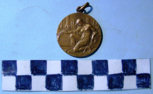 Di forma circolare. Sul recto, al centro in rilievo, due soldati degli eserciti piemontese e francese con le destre unite, sull'asta di un vessillo. Iscrizione lungo la corona e nella parte inferiore. Sul verso, figura allegorica femminile inginocchiata di fronte ad una lapide, nell'atto di deporre un ramo di palma. In secondo piano tra gli alberi la rocca di Solferino e la torre di San Martino della Battaglia. Iscrizione sulla lapide. Anello all'appiccagnolo.