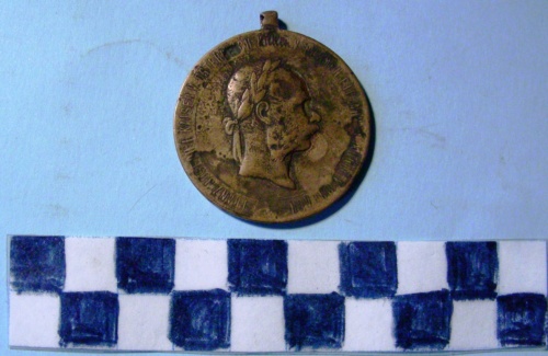 Di forma circolare. Sul recto, al centro in rilievo, busto accollato e laureato a destra di Francesco Giuseppe. Iscrizione lungo la corona. Sul verso, al centro, in rilievo, iscrizione tra rami di quercia e d'alloro stretti da nastro.