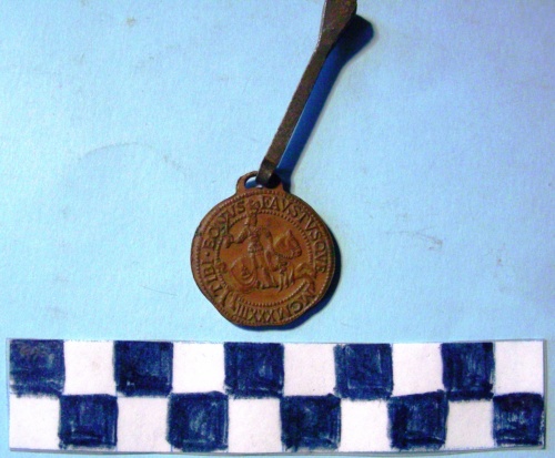 Di forma circolare, irregolare. Sul recto, al centro, in rilievo, circondata da iscrizione lungo la corona, la figura di un drago a sinistra che inghiotte un fanciullo. Sul verso, al centro, in rilievo, circondata da iscrizione lungo la corona la figura di un cavaliere medioevale a cavallo con gualdrappa, al galoppo a destra, con spada sguainata. Gancio metallico all'appiccagnolo