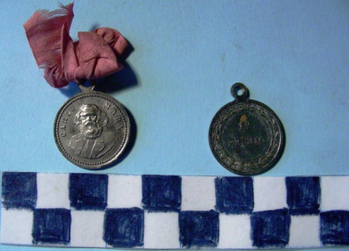 Di forma circolare. Sul recto, al centro, in rilievo entro perlinato, il busto di fronte di Marx. Iscrizione lungo la corona. Sul verso, iscrizione al centro entro perlinato e decorazione a motivi floreali lungo la corona. Una medaglia conserva un nastrino di colore rosso e spilla di fissaggio.