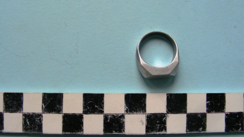 Anello con faccia superiore ad esagono con quattro triangoli scaleni degradanti.
