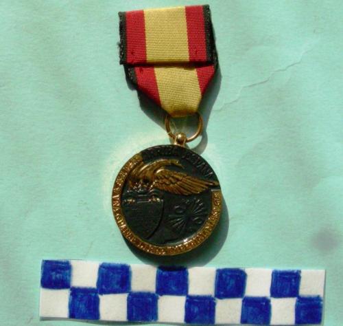 Disco brunito inciso con corona esterna dorata e decorata a motivi floreali, recante sul diritto quattro daghe dorate a 90 gradi con impugnatura verso il centro sormontate da un leone con la coda dritta che calpesta una figura mitologica alata con coda di serpente recante una falce e martello sull'ala. Sul retro 2/3 della corona dorata con iscrizione, un'aquila con ala spiegata e testa rivolte a destra, l'aquila stringe lo scudo reale della Spagna, sulla destra della medaglie un fascio di cinque frecce con giogo, nella parte inferiore un elmo. Il nastro è composto da due strisce nere esterne, due strisce rosse e da una striscia gialla al centro.