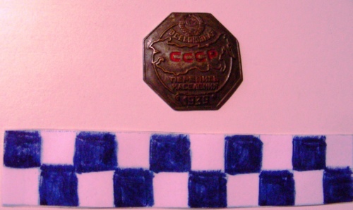Di forma ottagonale. Al centro in tondo nella parte superiore, il simbolo dell'Unione Sovietica con sottostante mappa dello stato. Iscrizioni in cirillico