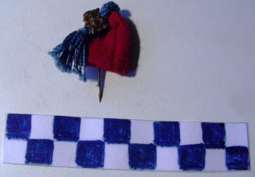 A forma di bomba di granatiere entro cornetta da cacciatore, con fiamma a sette lingue fuggenti a destra sovrastante due carabine incrociate. Sul verso, spilla di fissaggio. La spilla è inserita in un fez di colore cremisi con nappa di colore azzurro.
