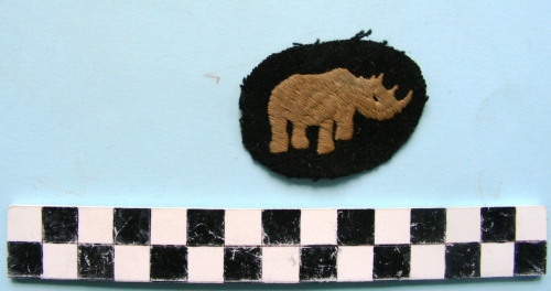 Rinoceronte di filo bianco ricamato su una base di panno color nero.