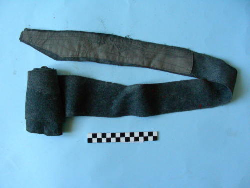 Striscia di dimensione variabile, di colore grigio-verde, con rinforzo ad una estremità e fascetta di fissaggio all'altra.