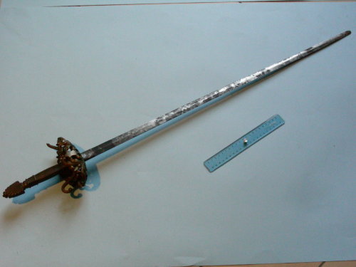 Lama dritta a doppio filo, sezione romboidale e punta smussata. Fornimento con guardia a tazza decorata a giorno con fogliami, crociera, fusetto e pomo.