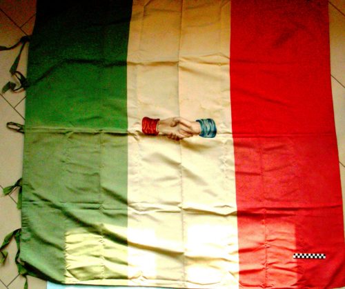 tricolore con una banda verde di rinforzo applicata sul lato corto dello stesso colore con 6 legacci doppi per il fissaggio all'asta. Un simbolo è stato dipinto al centro del colore bianco.