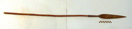lama a foglia, punta a sezione a losanga con nervatura centrale. Gorbia decorata da motivi geometrici incisi. Asta non originale.