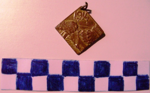 Di forma quadrata con maglietta applicata ad un angolo. Sul recto in rilievo due mani, una impugnante un pugnale. Iscrizioni nell'angolo si sinistra in alto e sulla manica della mano sinistra. Sul verso al centro in rilievo una fiaccola con iscrizione a sinistra.