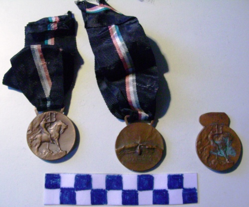 Di forma circolare. Sul recto, al centro, in rilievo figura maschile in nudità eroica su un cavallo fermo su di una roccia, nella sinistra uno stendardo e nella destra una statuetta della Vittoria alata. Iscrizione sotto la figura. Sul verso, al centro, in rilievo a sinistra e a destra, due file di mani che si protendono a salutare romanamente verso una fiamma. Iscrizione sotto la figura. Nastrino con il tricolore nazionale in campo nero.
