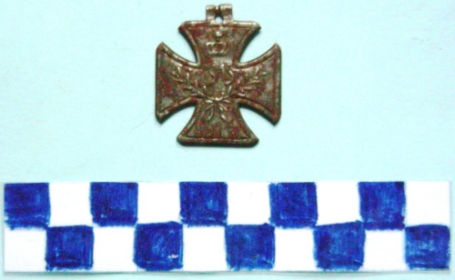 A forma di croce patente. Sul braccio superiore, foro per il fissaggio e sottostante corona crociata. Sui due bracci laterali, rami di alloro legati da un nastro. Iscrizioni al centro e sul lato inferiore.